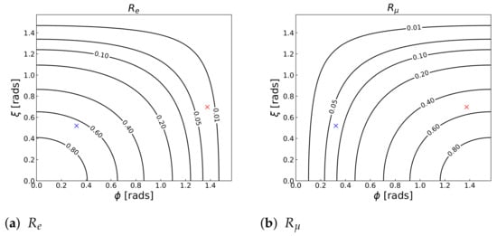 In Figure 1, we show the contour plots of (Figure 1a) and ((Figure 1b) in the - plane. The blue and red crosses correspond to the choice in Equation (35) with the normal and inverted orderings, respectively, which is the case for the scenario considered in Refs. [46,47,48]. We use NuFIT 5.3 [65] without the inclusion of the tabulated Super-Kamiokande atmospheric data to compute the PMNS matrix elements7.