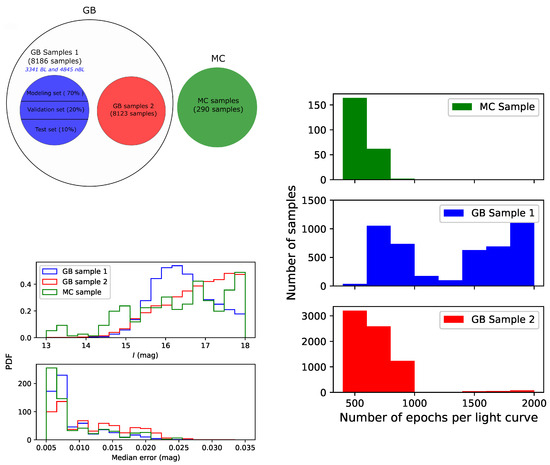 We also notice that the number of epochs for each light curve is negatively correlated with for the MC Sample. This indicates that, in the MC Sample, the stars that have been classified as nBL tend to have more points per light curve than those identified as BL stars. Note, however, that we have not observed such a trend in GB Sample 2 and the test set. The reason for this might be that GB Sample 2 and the test set have more data points per light curve, so such a correlation is not apparent. Meanwhile, the correlation between the number of epochs per light curve and for the MC Sample has an extremely high p-value for the correlation test (i.e., 0.37), indicating that this result might not be generalizable to other data sets. On the other hand, we observe an opposite trend in the test set. This perhaps reflects the fact that BL stars with more epochs per light curve can be detected more easily. Similar trends have also been observed by PS17 [26]. Figure 3 suggested that stars with fewer data points tend to have higher noise levels in the frequency spectra.