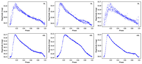Top row (BL stars) from left to right: OGLE-BLG-RRLYR-00162, OGLE-BLG-RRLYR-00184, OGLE-BLG-RRLYR-00197. Bottom row (nBL stars) from left to right: OGLE-BLG-RRLYR-00183, OGLE-BLG-RRLYR-00199, and OGLE-BLG-RRLYR-00208. The period is adopted from Soszyński et al. [7]. A major distinction between BL stars and nBL sources is the large dispersion near the peak of the light curve, reflecting both the period and amplitude variation due to the BL effect.