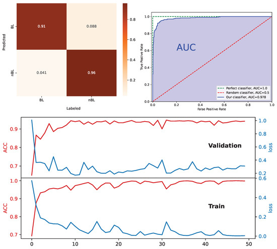 The testing and training results. A normalized confusion matrix for the test set (top left). The vertical axis (Labeled) stands for the results labeled by frequency spectra, while the horizontal axis (Predicted) stands for the results predicted by our CNN model. The receiver operating characteristic curve (ROC) and AUC for our model (top right), and the ROC curve and AUC for a random classifier and a perfect classifier are drawn and labeled for comparison. The area under the ROC curve for the perfect classifier (plotted in green) and the random classifier (plotted in red) is 1.0 and 0.5, respectively. The training curves are attached at the bottom.