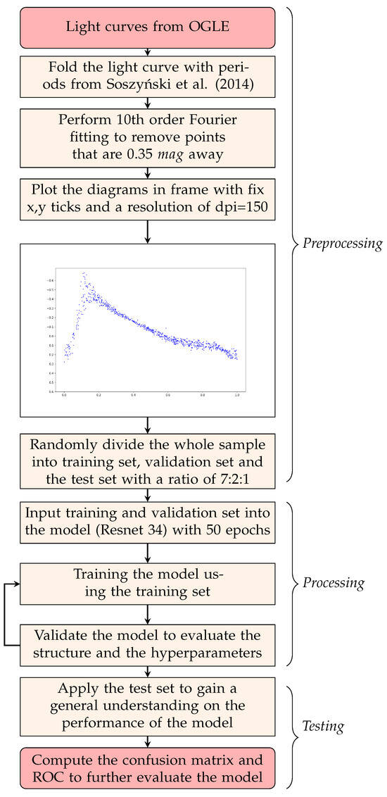 where represent the possibility of being BL stars, and and represents the output for labels BL and nBL, respectively. Stars with greater than 0.5 are classified as BL candidates and vice versa. We then compare the classification results with those obtained from frequency analysis to determine the performance of the model. These results are discussed in detail in Section 4.1. A flow chart of the procedures that we used to train the model can be found in Figure 4.