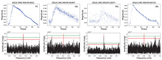 BL stars are commonly identified through their distinct characteristics of frequency spectra. The frequency spectra of BL stars are characterized by equidistant side peaks, i.e., around the fundamental pulsation frequency (dubbed as ). Meanwhile, if the BL star also shows amplitude modulation, then could appear on its own in the range of ∼0.0001 to 0.2 [c/d]1 [33,34]. Normally, BL samples can be identified by first estimating the basic pulsation frequency () and then searching for side peaks in the residual frequency spectrum after pre-whitening . RRab stars can be identified as a BL subclass if the side peaks of their light curves have a significant signal-to-noise ratio (). Several studies have adopted different definitions of significance, perhaps depending on their light curves’ quality for identification [25,26,27,35].