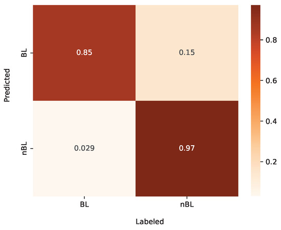 After dividing BL/nBL sources classified by frequency spectra from GB Sample 1 into the training set, validation set, and test set with a ratio of 7:2:1, the model is trained to identify BL stars. This training process involved using the training set with the help of the validation set directly from diagrams of the phased light curves to train our CNN model. Using the test set, we estimate that our model has an ACC of 0.935 and an AUC of 0.978. As the pulsation period for each source is not taken into account in our training process, the high ACC and AUC scores for our model further indicate that the BL modulation can be well-characterized by light-curve structure without considering the period of pulsation.