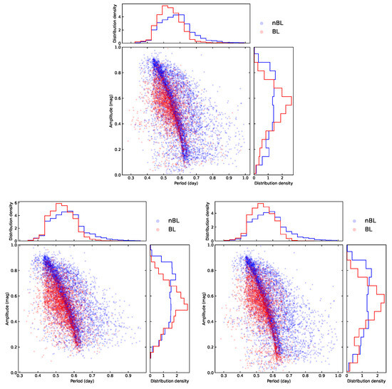 It is noteworthy that the parameter seems to have moderately negative dependence on and for all of the three data sets, indicating that the nBL sample tends to have larger and values. This is consistent with the trends shown in Figure 8. Both Jurcsik [60] and PS17 [26] observed similar trends using samples from Messier 3 (M3), Galactic Disk, and Galactic Bulge.