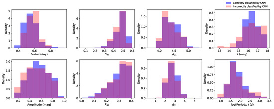 These misclassified samples are subsequently subjected to careful examination as well. Similar to the test set, these inaccurately classified test samples exhibit lower amplitudes or noisier light curves in comparison to those classified correctly.