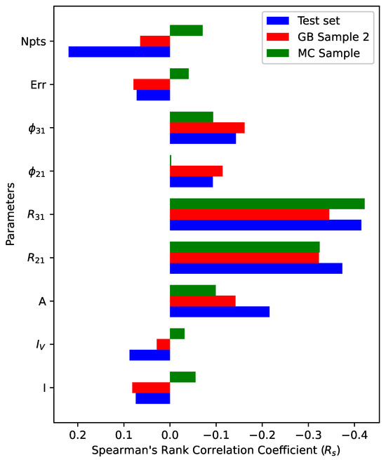 An analysis of Figure 12 reveals that the Spearman correlation coefficient p derived for the MC Sample is much larger than those derived for the other two data sets, perhaps due to limited sample size. The p-values of all the parameters derived on the base of the test set and GB Sample 2 are smaller than 0.01, while the typical p-value is greater than 0.1 for the MC Sample.