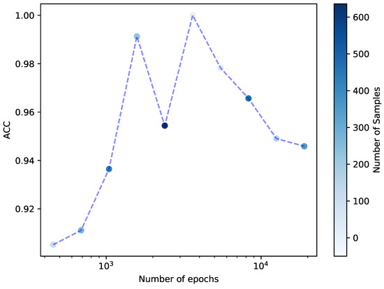 Number of epochs vs. ACC for our test samples. Please note that the transparency of the dots has been adjusted to correspond with the number of samples contained within each bin.