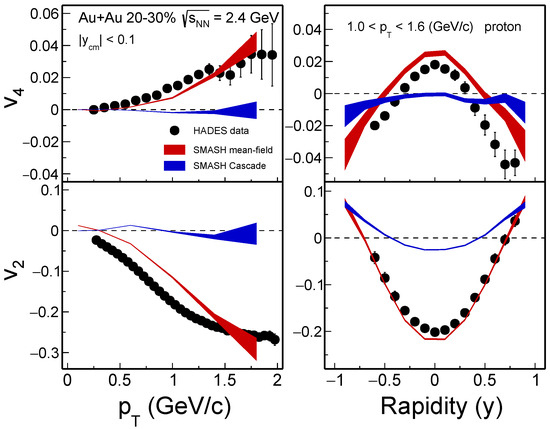 The recent measurements of collective flow from the HADES experiment at = 2.4 GeV [20,25] have been compared with predictions from the SMASH model, incorporating both mean-field and cascade modes. These model calculations were performed using the same centrality intervals and kinematic selections as the experimental data. Figure 1 illustrates the transverse momentum and rapidity dependence of elliptic flow and quadrangular flow for protons in 20–30% centrality Au+Au collisions at = 2.4 GeV. The experimental data, shown as solid symbols, are overlaid with the SMASH predictions, where the red and blue bands correspond to the calculations from the mean-field and cascade modes, respectively. A significant signal has been observed for the first time in heavy-ion collisions at such low energy by the HADES experiment. As shown in Figure 1, the for protons at mid-rapidity is initially positive, but then transitions to negative values in the forward rapidity region. Additionally, increases with rising transverse momentum. In contrast to the behavior, the proton at = 2.4 GeV is negative and reaches its maximum anisotropy at mid-rapidity, increasing from mid- to forward rapidity. A strong transverse momentum dependence is also observed in the mid-rapidity region. The spectators, which are nucleons that do not participate in the collisions, remain primarily in the mid-rapidty region and create a ‘shadowing’ effect. This shadowing suppresses transverse expansion in directions perpendicular to the reaction plane during the early stage of the system’s evolution. Consequently, this results in a negative at mid-rapidity, as the in-plane expansion is more inhibited than the out-of plane expansion. In contrast, at forward rapidity, the influence of the spectators diminishes, as this region is less affected by their shadowing effect. This reduction in suppression allows particles at forward rapidity to undergo more transverse expansion, leading to a larger or even position .