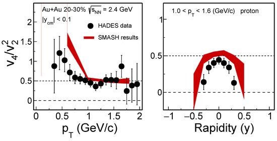 The ratio for protons in the 20–30% centrality interval as a function of transverse momentum and rapidity y is presented in Figure 2. The HADES experimental measurements are shown by solid circles, while the SMASH calculations incorporating the mean-field potential are represented by red bands. As shown in the left panel of Figure 2, the ratio measured in the HADES experiment exhibits a clear -dependent behavior. The ratio decreases with increasing transverse momentum for 1.0 GeV/c and becomes approximately constant at higher . The SMASH calculations, which include a mean-field potential, qualitatively describe the experimental data and reproduce a ratio of about 0.5 in the high- region ( 1.0 GeV/c) at mid-rapidity ( 0.1). The right panel shows the rapidity dependence of for protons, integrated over the high- region in the 20–30% centrality interval. The SMASH model calculations again qualitatively reproduces the experimental data, showing a ratio close to 0.5 at mid-rapidity, which decreases significantly at forward rapidities. Overall, the ratio for protons demonstrates significant and rapidity dependence, as observed in both the HADES data and SMASH calculations. Notably, the ratio calculated for high- protons ( 1.0 GeV/c) at mid-rapidity ( < 0.1) approaches a value of approximately 0.5, surprisingly aligning with expectations based on hydrodynamic behavior [39]. However, this result should be interpreted as a qualitative agreement with the experimental data rather than a direct evidence of hydrodynamic behavior.