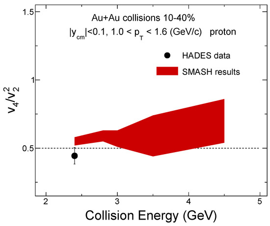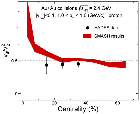 where is the azimuthal angle of the particles and is the reaction plane angle. The second- and fourth-order coefficients are called elliptic flow and quadrangular flow . These observables provide valuable insights into the system’s expansion dynamics, reflecting initial spatial asymmetries in momentum space during the evolution of the QGP or hadronic matter [35,38]. Theoretical calculations suggest that the quadrangular flow divided by the squared elliptic flow can serve as a probe of the system’s ideal hydrodynamic behavior when this ratio, , is approximately 0.5 [39]. Measurements from RHIC-PHENIX and RHIC-STAR at = 200 GeV [40,41], as well as from the LHC [42,43], have shown that the ratio tends to be close to 1. This deviation from ideal hydrodynamic behavior is potentially due to the effects of finite shear viscosity, non-equilibrium dynamics, flow fluctuations, and more complex flow patterns in high-energy collisions [44,45]. The measurements of at high baryon density in = 2.4 GeV Au+Au collisions observed in the HADES experiment are systematically close to 0.5 [20,25]. However, we know that the system’s dynamics may be markedly different from those in high-energy collisions, as baryonic interactions play a dominant role in shaping the system’s evolution in such a high-baryon-density regime [46,47], as indicated by recent STAR flow measurements in = 3 GeV Au+Au collisions [21,48,49].