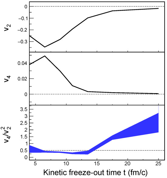 Next, we examine the time evolution of elliptic flow and quadrangular flow to investigate the transformation of nuclear matter. The freeze-out time on the x-axis of Figure 4 refers to the kinetic freeze-out time of protons, within t ± 1 fm/c.The first and second panels of Figure 4 show and of protons as a function of the kinetic freeze-out time in Au+Au 20–30% collisions at = 2.4 GeV, using the SMASH model with the mean-field potential. At the early stage of expansion (freeze-out time t ≲ 10 fm/c), exhibits well-defined negative values, while shows prominent positive values, reflecting the initial collision geometry with large eccentricity. Note that a negative implies emission out-of-plane due to the strong spectator shadowing effect [21,53]. As time progresses ( 10 fm/c), the magnitudes of and gradually decrease and approach zero. This indicates that the initial anisotropic pressure gradients of the dense bulk vanish, and the system becomes more isotropic as the evolution progresses.