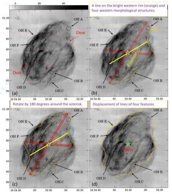 To allow a better visual inspection of the rim on the west and east and the two inner filaments, on Figure 3d I displace outward the marks of the two rims and the two inner filaments. I also mark the location of the pulsar-wind nebula (PWN; e.g., [,]). This PWN likely influenced the filament on the southwest; hence, I do not expect a perfect point symmetry between the two opposite filaments marked by the dotted yellow lines in Figure 3b–d.