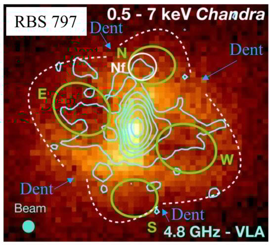 An X-ray image of the cooling flow cluster of galaxy RBS 797 from []. Ellipses show the shape of the X-ray cavities. Cyan contours are radio emission at 4.8 GHz from []. White dashed arcs encompassing the rims of the bubbles are from their image. Where two rims meet, there is a dent, as I indicate by the four arrows.