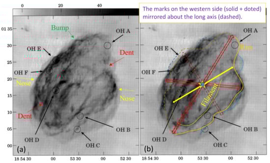 Similar to the first two panels of Figure 3, (a) The original image from [], but on (b), the structures marked on the west side are mirrored about the long axis (long double-headed arrow); the mirrored marks are the dashed lines. The bright rims in the west and east are not mirror images.
