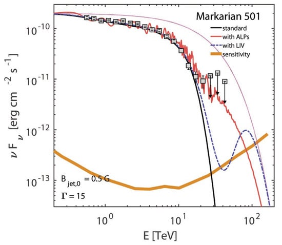 Markarian 501 is a bright high-frequency peaked BL Lac (HBL) located at a redshift . Its active states, whose most impressive example is represented by the HEGRA observations reaching energies above with a hard spectrum [], are considered extremely promising for the study of possible new physics signals []. Due to the high variability of Markarian 501, the hadron beam scenario is not applicable to this source, so that, as reported in Figure 1, we consider only the effects induced by the photon–ALP interaction and by LIV. Concerning the emission mechanism, we assume a leptonic model with , , and []. Moreover, to describe the intrinsic spectrum, we adopt an exponentially truncated power law with energy index and cutoff energy (for more details see []).