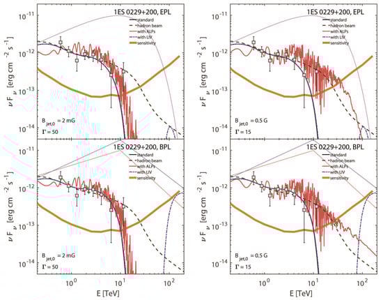 1ES 0229+200 is the archetype of extreme high-frequency peaked BL Lacs (EHBLs), with a hard spectrum observed beyond [], despite its relatively high redshift , where the EBL absorption at TeV energies is strong (see, e.g., []). Moreover, EHBLs show an untypical low variability with respect to other BL Lacs [], which allows us to apply to 1ES 0229+200 not only the photon–ALP interaction and LIV models but also the hadron beam scenario, as shown in Figure 2.