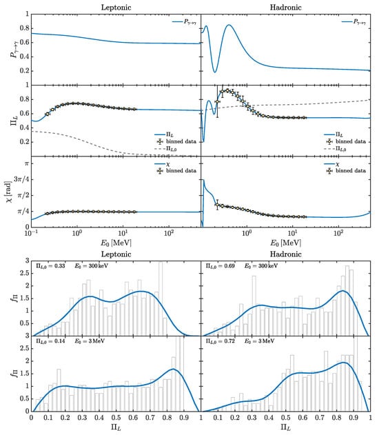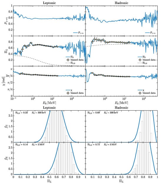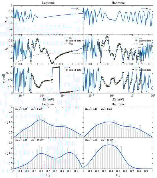 Still, in the HE band but taking the ALP parameters , , we report the behavior of , and in the top subfigure of Figure 5 and the associated for the benchmark energies: (i) , (ii) in the bottom subfigure of Figure 5. The left panels of Figure 5 display the results obtained within the leptonic emission model, while the right panels report the findings within the hadronic one. As shown by the top subfigure of Figure 5, the photon–ALP system propagates in the weak mixing regime, as the effect of the higher ALP mass term ( with respect to the previously considered ) cannot be neglected in comparison with the photon–ALP mixing term. Consequently, , and turn out to be energy dependent in all the examined band with a substantial modification of the final with respect to the initial especially in the leptonic case. As previously noted in the X-ray band for and , the extended energy range over which the photon–ALP system remains in the weak mixing regime arises from the significant spatial variation of and (see also [,] for further details). The binned data presented in the top subfigure of Figure 5 suggest that future polarimetric missions, such as COSI [], e-ASTROGAM [,], and AMEGO [], could be sensitive to ALP-induced modifications of for , under both leptonic and hadronic emission scenarios.