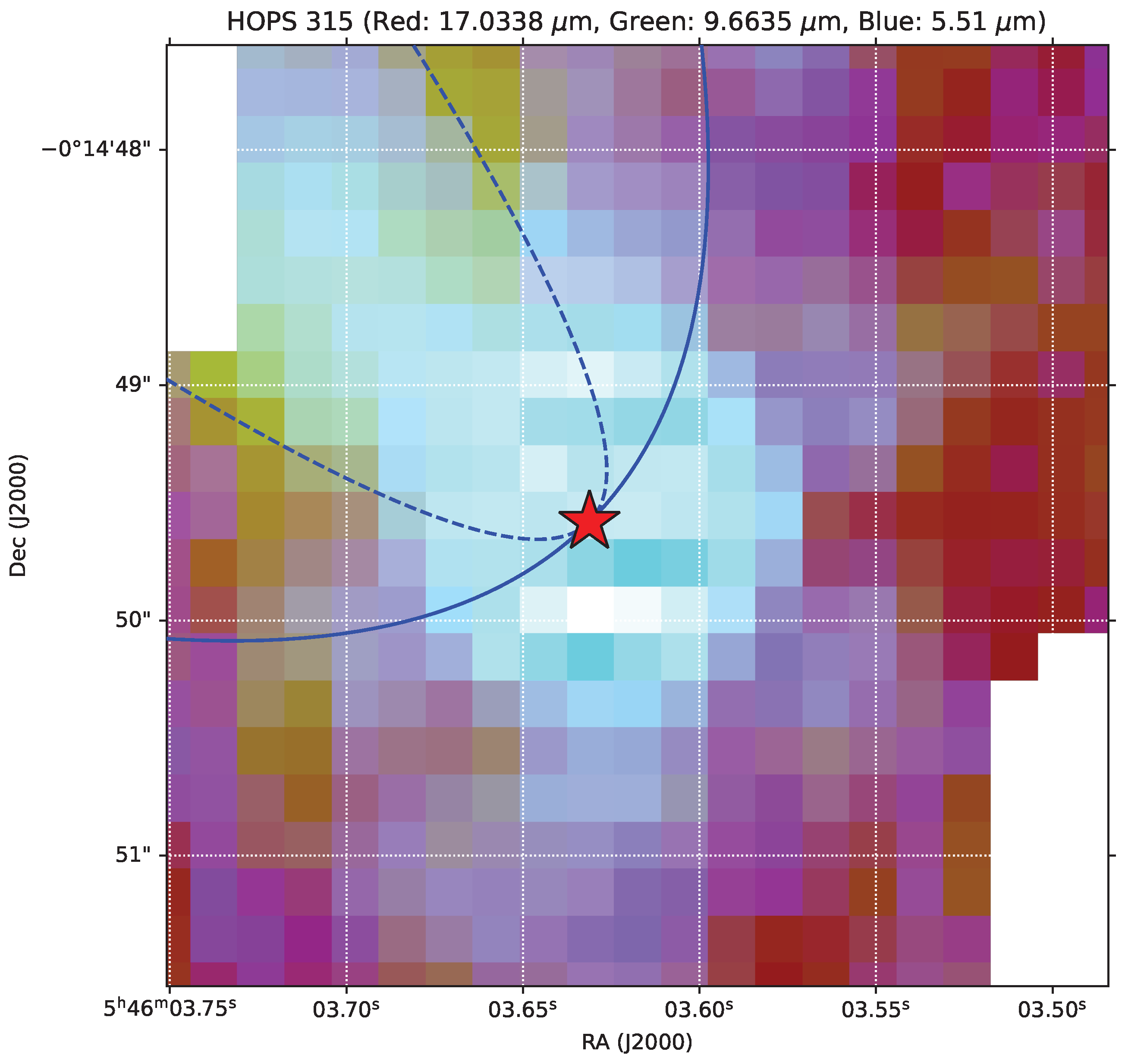 - Vleugels, C.; McClure, M.; Sturm, A.; Vlasblom, M. The H2 jet and disk wind of the Class I protostar HOPS 315. Astron. Astrophys. 2025, 695, A145. [Google Scholar] [CrossRef]