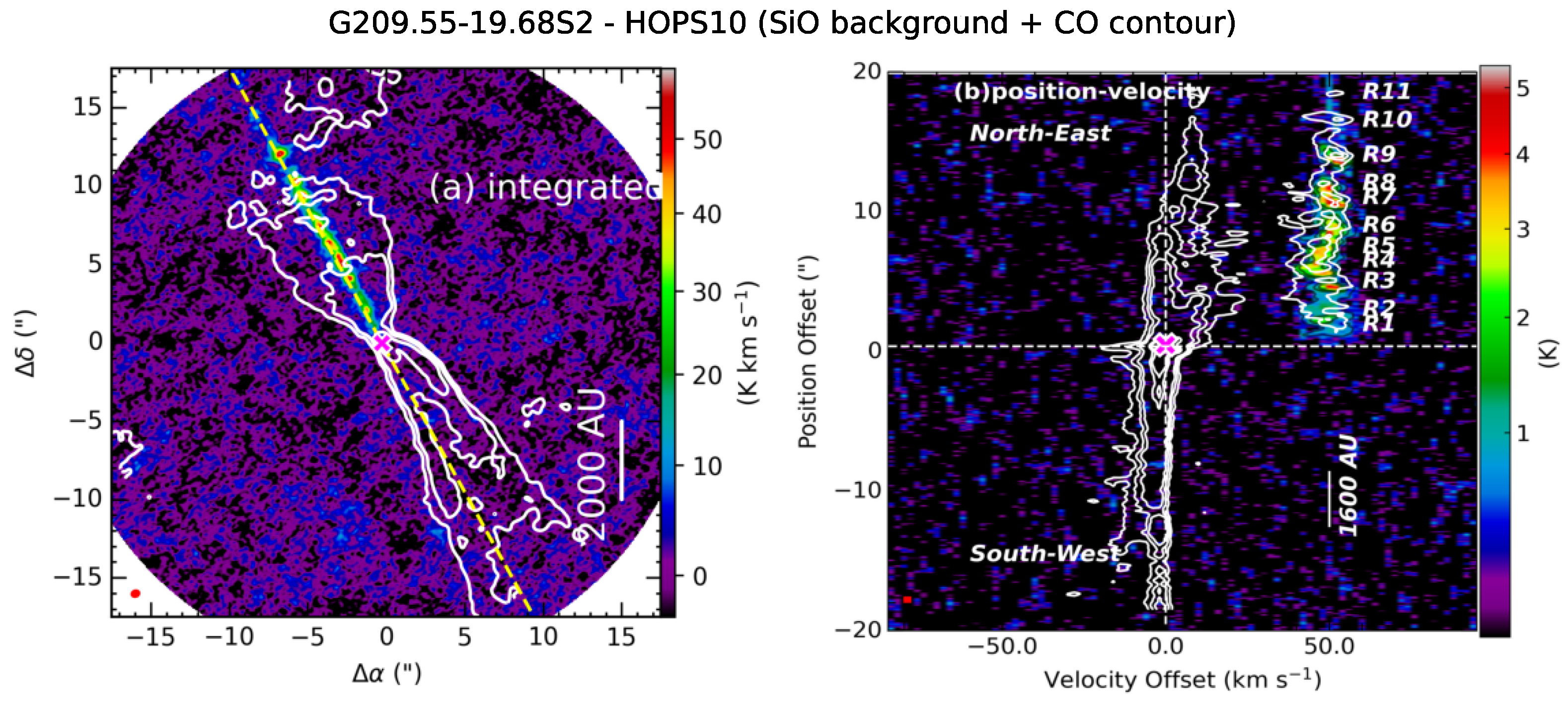 - Jhan, K.S.; Lee, C.F. 25 au Angular Resolution Observations of HH 211 with ALMA: Jet Properties and Shock Structures in SiO, CO, and SO. Astrophys. J. 2021, 909, 11. [Google Scholar] [CrossRef]