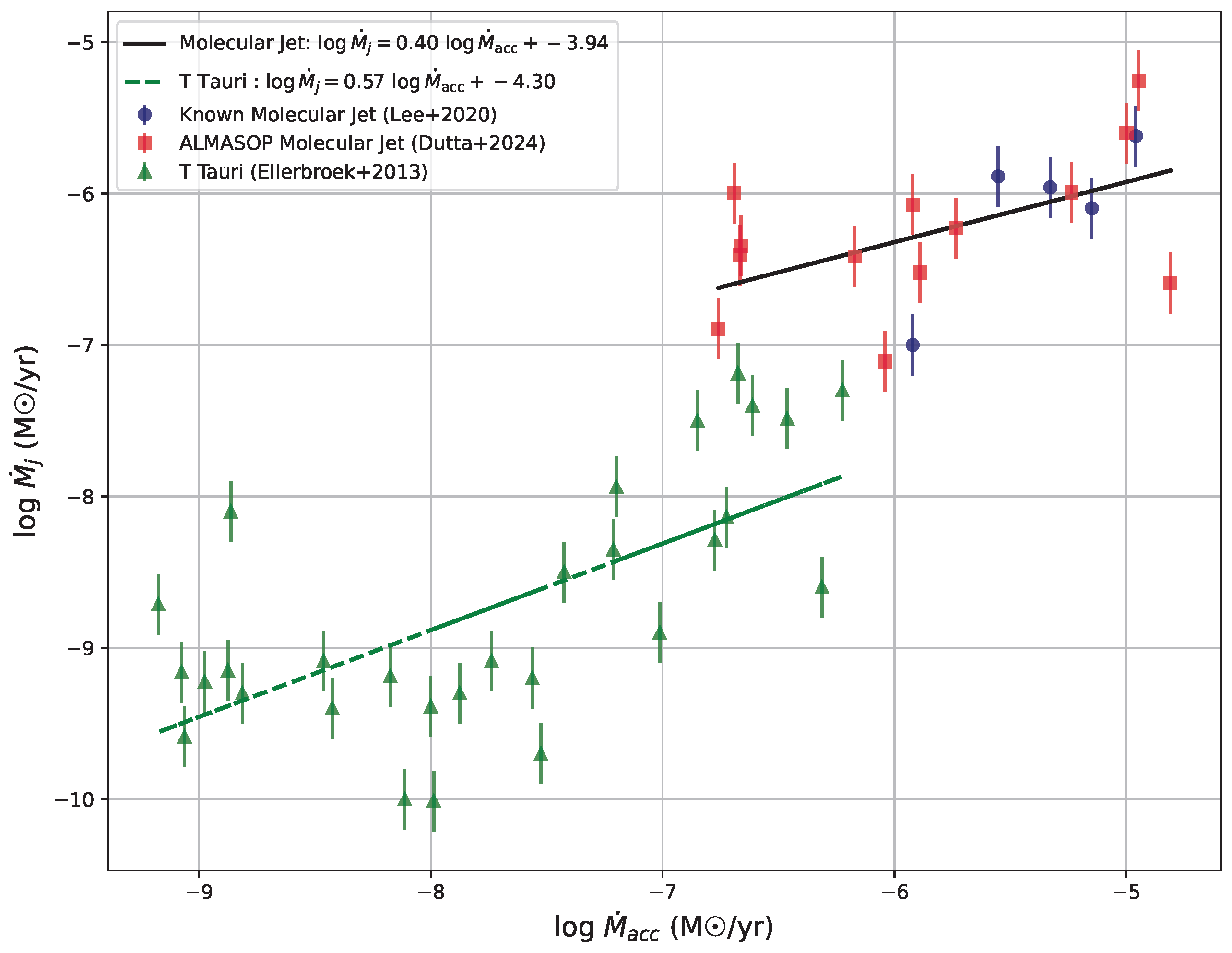 - Dutta, S.; Lee, C.F.; Johnstone, D.; Lee, J.E.; Hirano, N.; Di Francesco, J.; Moraghan, A.; Liu, T.; Sahu, D.; Liu, S.Y.; et al. ALMA Survey of Orion Planck Galactic Cold Clumps (ALMASOP): Molecular Jets and Episodic Accretion in Protostars. Astron. J. 2024, 167, 72. [Google Scholar] [CrossRef]