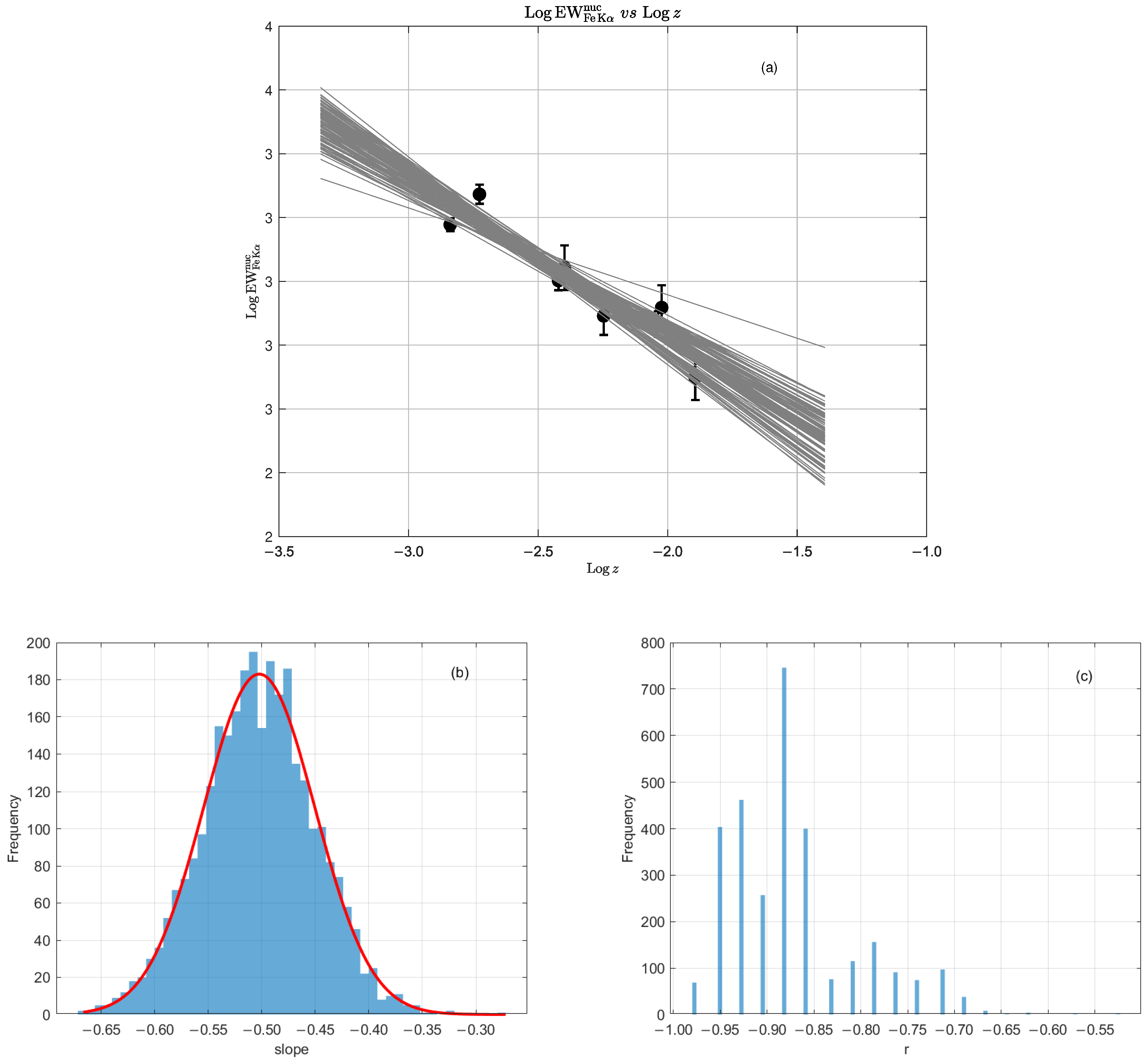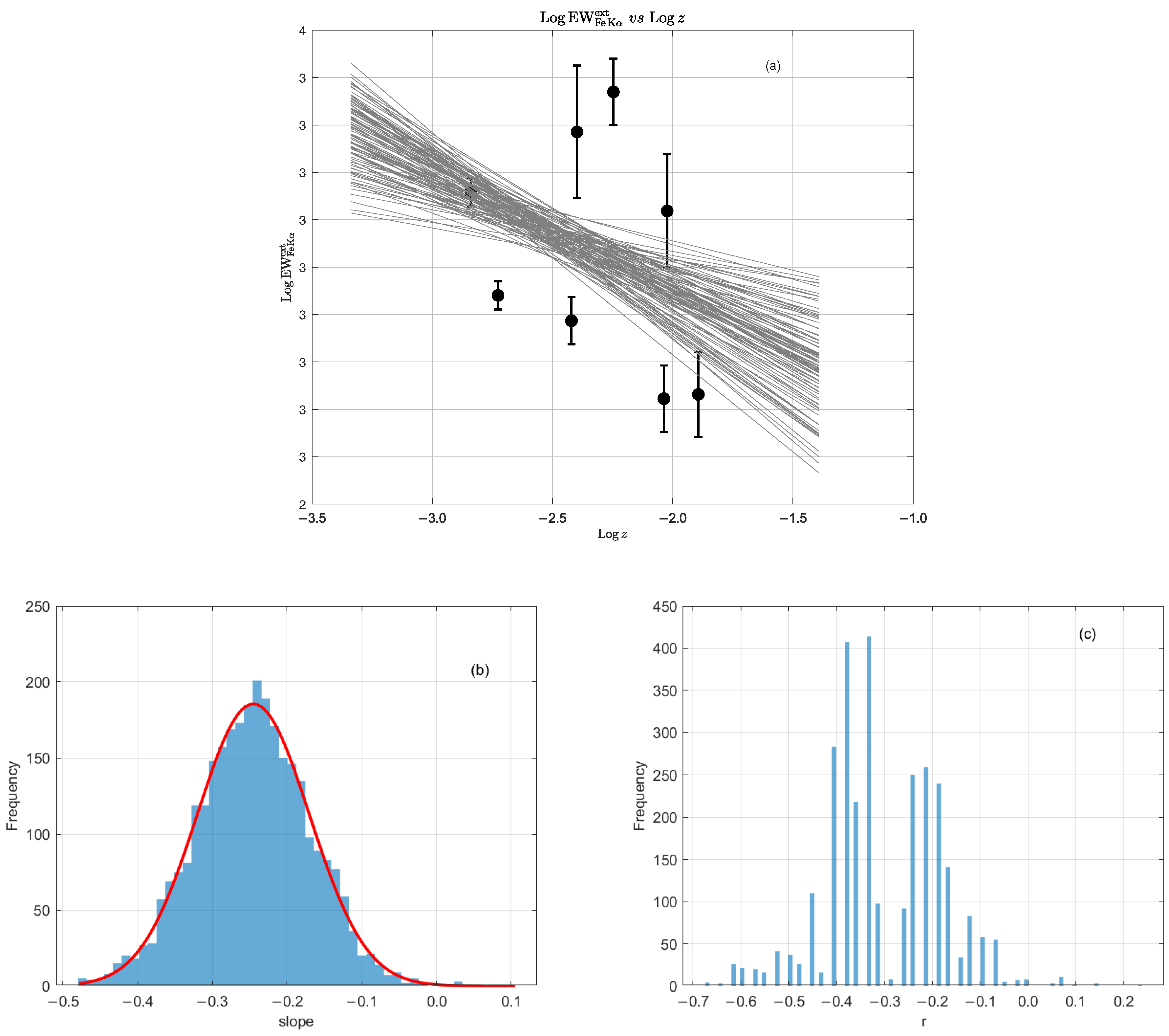- In the nuclear region, the Fe K equivalent width is inversely correlated with both nuclear luminosity and redshift, with the correlation with redshift appearing stronger. Conversely, in the extended region, no significant inverse correlation with redshift is discernible.
