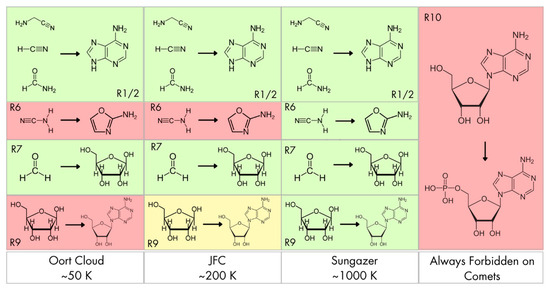 Comets are “Cosmic Shuttles” known to harbor organic molecules relevant to prebiotic chemistry, including hydrogen cyanide (HCN) [1], ammonia (NH3) [2], formaldehyde (H2CO) [3], methanol (CH3OH) [4], formic acid (HCOOH) [5], and phosphate-bearing minerals [6], as confirmed by direct and indirect observational data from space missions such as Rosetta, e.g., ROSINA (Rosetta Orbiter Spectrometer for Ion and Neutral Analysis), ALMA (Atacama Large Millimeter/Submillimeter Array), and COSAC (gas analyzer Cometary Sampling and Composition) to comet 67P/Churyumov-Gerasimenko [7]. The detection of these molecular precursors, also in dust [8], is of crucial importance: they represent essential building blocks for the synthesis of complex organic molecules such as amino acids, sugars, nucleobases, nucleosides, and nucleotides, i.e., main components required for the emergence of life [9]. Cometary nuclei likely are over most of their history at temperatures of about 50 K while their surfaces and the outer layers, where most chemistry is active, are subject to extreme thermal cycling ranging from cryogenic temperatures of ~50 K in the Oort cloud to over 300 K at ~1 AU and even above 1000 K for sungrazing comets [10]. In addition, cometary surfaces are exposed to ultraviolet (UV) radiation, cosmic ray, and sporadic heating during perihelion passages [11]. These distinctive conditions enable chemical reactions that might be energetically unfavorable or kinetically inaccessible under standard terrestrial conditions, making comets ideal natural laboratories for prebiotic chemistry [12]. Within nuclei superficial regions, photochemical activation and radical-mediated pathways can facilitate reaction routes not typically available under ambient planetary conditions [13].