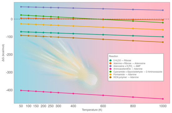 To evaluate the thermodynamic feasibility for seven key prebiotic reactions, involved in prebiotic synthesis of nucleobases, sugars, nucleosides, and nucleotides, to occur on cometary nuclei, I estimated the Gibbs free energy variation, ΔG, at temperature, T, spanning from 50 K to 1000 K, mimicking different cometary conditions. Standard enthalpies of formation (ΔH°f) and molar entropies (S°) for the molecular species involved were collected from experimental databases, e.g., NIST (www.nist.gov/publications, accessed on 20 April 2025), Cheméo (www.chemeo.com, accessed on 20 April 2025), and from [22] for adenosine and adenosine 5′-monophosphate. Where unavailable, values were estimated by analogy with structurally related molecules. All molecular states were considered in their condensed form, i.e., solid or liquid, except for CO which was treated as gas under standard conditions. This approximation is consistent with thermodynamic convention for condensed-phase systems, where activities of solids and liquids are typically set to unity.