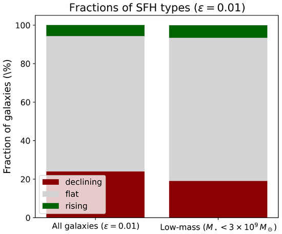 Fraction of galaxies classified as flat, declining, or rising SFHs based on the median slope . Flat is defined as , declining as , and rising as . These thresholds reflect a tolerance zone that prevents tiny fluctuations from being misclassified as trends. The left panel is for all galaxies while the right panel is for galaxies with .