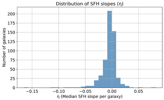 Distribution of median SFH slope across the galaxy sample. The distribution peaks near , indicating that flat SFHs are statistically dominant. A small tail toward negative suggests that moderately declining SFHs are possible for some galaxies, but strongly declining or rising histories are rare. The histogram contains 555 galaxies (see Section 3).