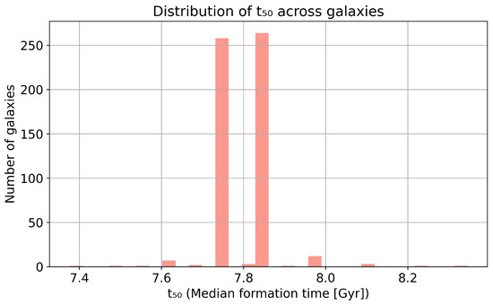 Distribution of values across the galaxy sample. The strong peaks near ≈ 7.72 and 7.86 Gyr indicates that most galaxies formed half of their stellar mass relatively late in cosmic time. The discrete structure arises from resolution limits in the time grid, but the concentration toward recent formation is robust. The histogram contains 555 galaxies (see Section 3).