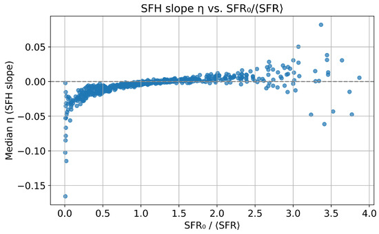 Figure 4 shows a strong and coherent positive correlation between the SFH slope and . Galaxies with low present-day SFRs compared to their historical average () predominantly exhibit negative values of , indicative of declining SFHs. In contrast, systems with tend to cluster near , consistent with flat star formation over cosmic time. Notably, galaxies with —those forming stars more vigorously now than on average—show progressively more positive , with signifying rising SFHs. A small number of galaxies show negative values even at high ; these are consistent with systems that underwent a recent burst followed by a rapid decline, or they may reflect uncertainties in estimates.