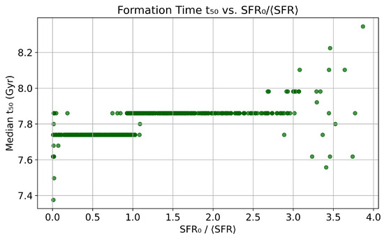 Figure 5 displays the corresponding trend between and . A clear positive correlation is again observed: galaxies with low SFR ratios tend to have earlier formation times (≈ 7.6–7.9 Gyr), whereas systems with typically show Gyr. In other words, galaxies that are currently forming stars more actively relative to their past have also formed a larger fraction of their stellar mass more recently.
