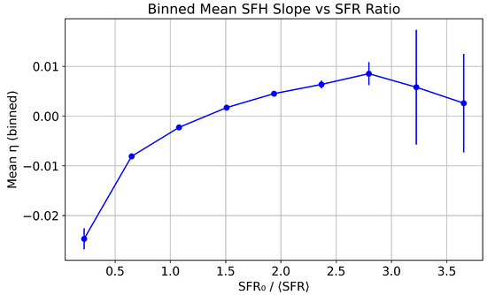 Binned mean SFH slope as a function of the SFR ratio (values of and from Kroupa et al. [5]). Each bin represents the mean of galaxies falling within a given range of , with vertical error bars showing the standard error of the mean. Galaxies with consistently exhibit rising SFHs, while those with tend to have flat or declining histories.