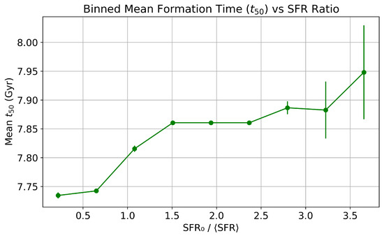 Binned mean formation time as a function of the SFR ratio (from Kroupa et al. [5]). Each bin represents the mean of galaxies within a given range of , with vertical error bars corresponding to the standard error of the mean. Galaxies with higher tend to form their stellar mass later in cosmic time, consistent with sustained or rising SFHs.