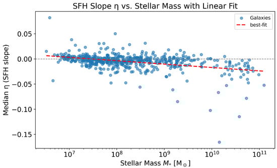 Relation between the median SFH slope and stellar mass . Each point corresponds to one galaxy and shows the median derived from its accepted SFHs. The red dashed line shows the best-fitting linear relation (Equation (17)) in . As in previous figures, medians are used because the distributions are often skewed, and provides a robust estimate of the uncertainty on the median.The slight negative slope indicates a trend whereby more massive galaxies tend to exhibit declining SFHs (results comparable to Haslbauer et al. [8]).