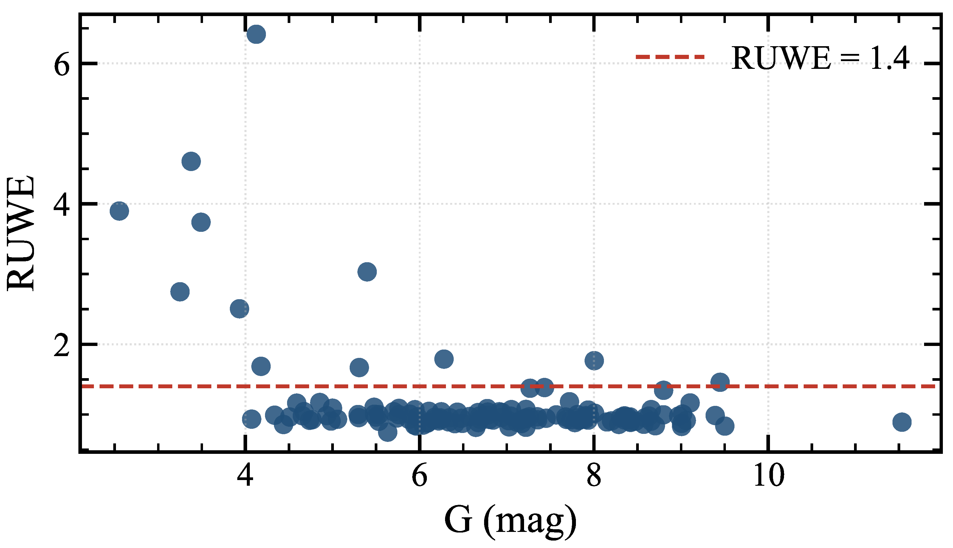 | N | Name | [pc] [29] | [pc] | RUWE | G [mag] | [pc] | [pc] | L [pc] | |
