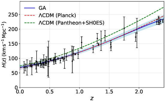 Compilation of measurements with the GA best-fit (solid blue curve), the ΛCDM model from Planck 2018 (dashed red curve), and the ΛCDM model from Pantheon+SH0ES (dashed green curve). The light blue region represents the ( confidence level) for the GA model, while the black points with error bars represent the observational data.