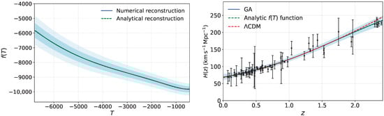 As an additional consistency check, we compare the evolution of the Hubble parameter predicted by three models: (i) the direct GA reconstruction, (ii) the analytic function obtained from the second genetic algorithm, Equation (23), and (iii) the standard ΛCDM cosmology, using Planck 2018 data. The results are shown in the right panel of Figure 2. For redshifts , the three curves are in close agreement. At higher redshifts, deviations appear, although this may be attributed to the limited availability of direct measurements in that range. This comparison reinforces the robustness of our reconstruction and highlights the potential of the genetic algorithm approach for probing the functional structure of gravity.
