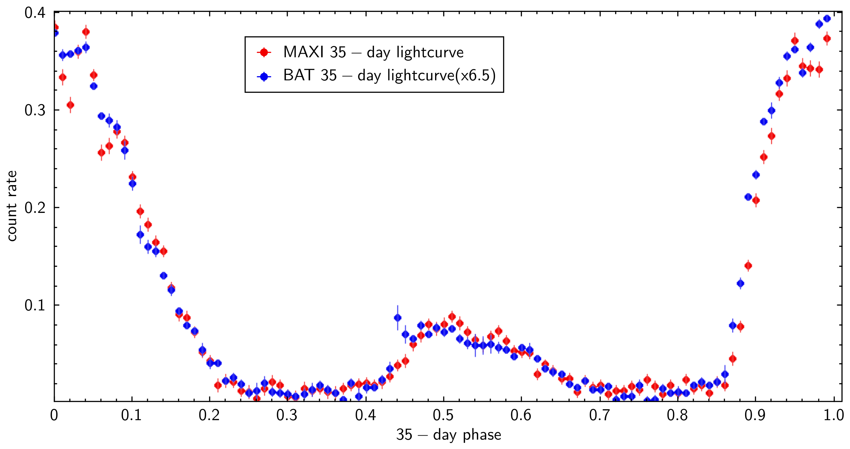 Figure 1. Swift/BAT and MAXI count rates and errors (from [20]) for the Her X-1 35-day cycle, with 35-day phase 0 set at peak of Main High state. Eclipse data were excluded prior to analysis.