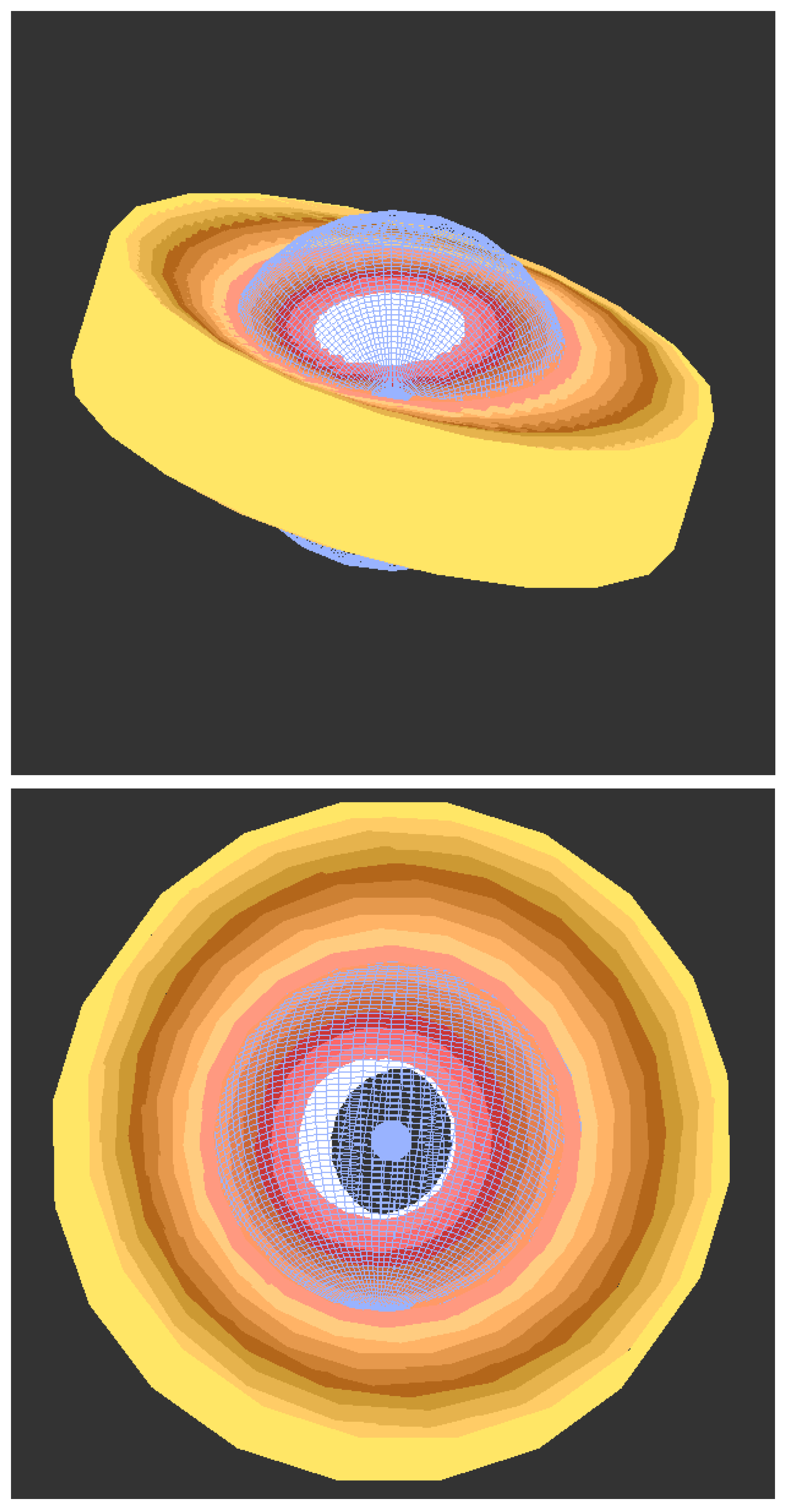 Figure 3. The inner and boundaries of the disk and corona. The (top panel) shows the observer view at 35-day phase 0; the observer is situated at 5 degrees above the orbital plane. The (bottom panel) shows the top view from perpendicular to the orbital plane. The inner and outer boundaries of the corona are the small and large blue spherical grids; the inner disk boundary is the white cylinder, the top and outer disk boundaries are shown by the pink to brown to yellow colored rings. The corona has a powerlaw density distribution; each disk ring has a Gaussian density distribution.