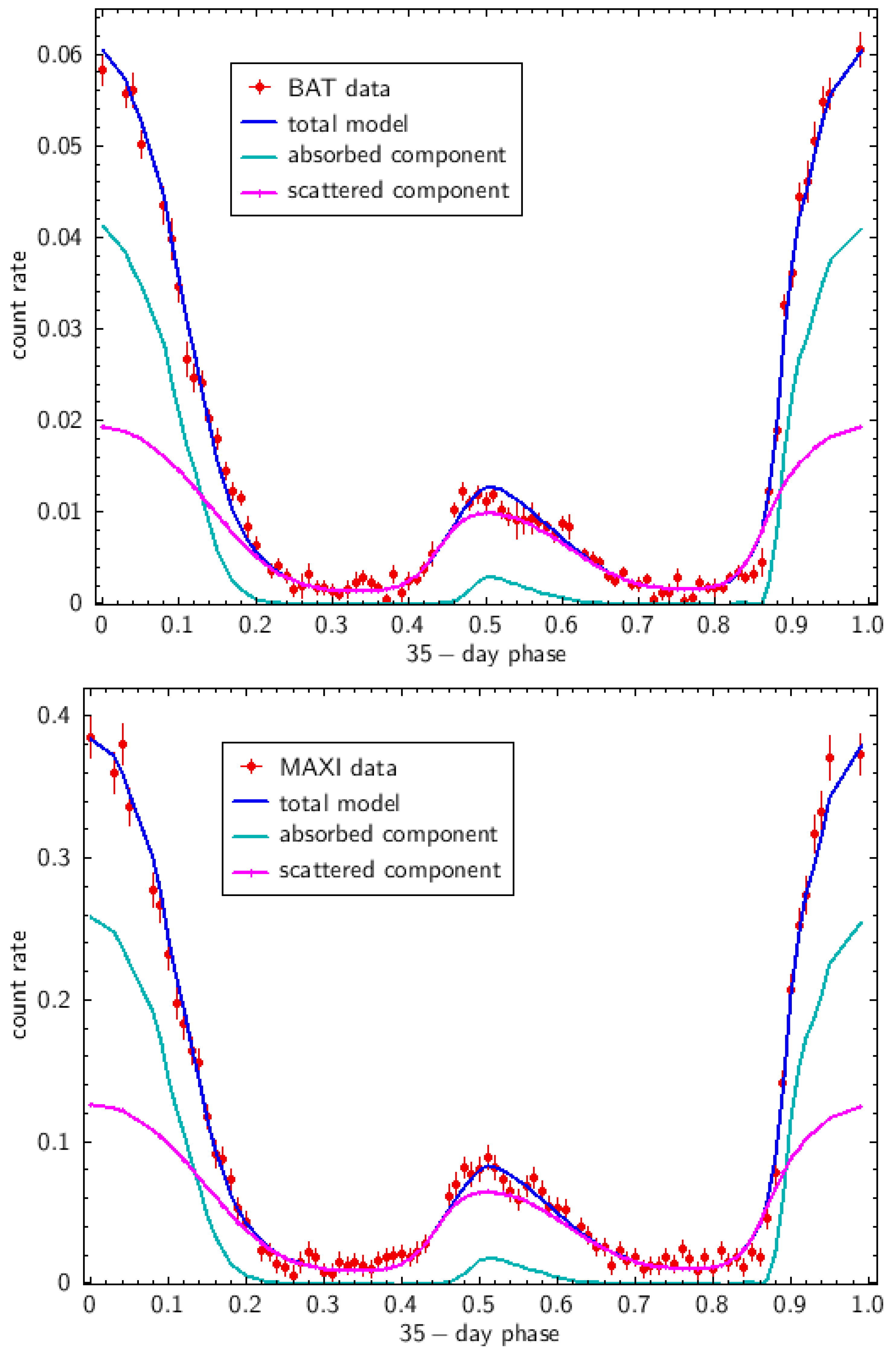 The accretion disk has a low ionization state so we take the absorption cross-section to be a sum of the photoelectric and Thompson cross-sections (the latter accounts for X-rays that are scattered once then absorbed). The matter in the corona is highly ionized so the cross-section is that for Thompson scattering. In Shape one can split the spectrum into several energy bands, so that each energy band has a separate ray-tracing calculation, after which the energy bands are summed. We compared using 7 energy bands (each for 15–50 keV for BAT, and 2–20 keV for MAXI) and using 3 energy bands and did not find any difference in the resulting lightcurves. Thereafter 3 energy bands were used. The Shape calculations were repeated for 41 different consecutive rotation phases of the accretion disk to create a model light-curve over the full range of 35-day phase. The model was then interpolated to the observed phases for fitting. Different interpolation methods were compared and cubic spline with linear endpoints was found to be the most accurate, thus was adopted.