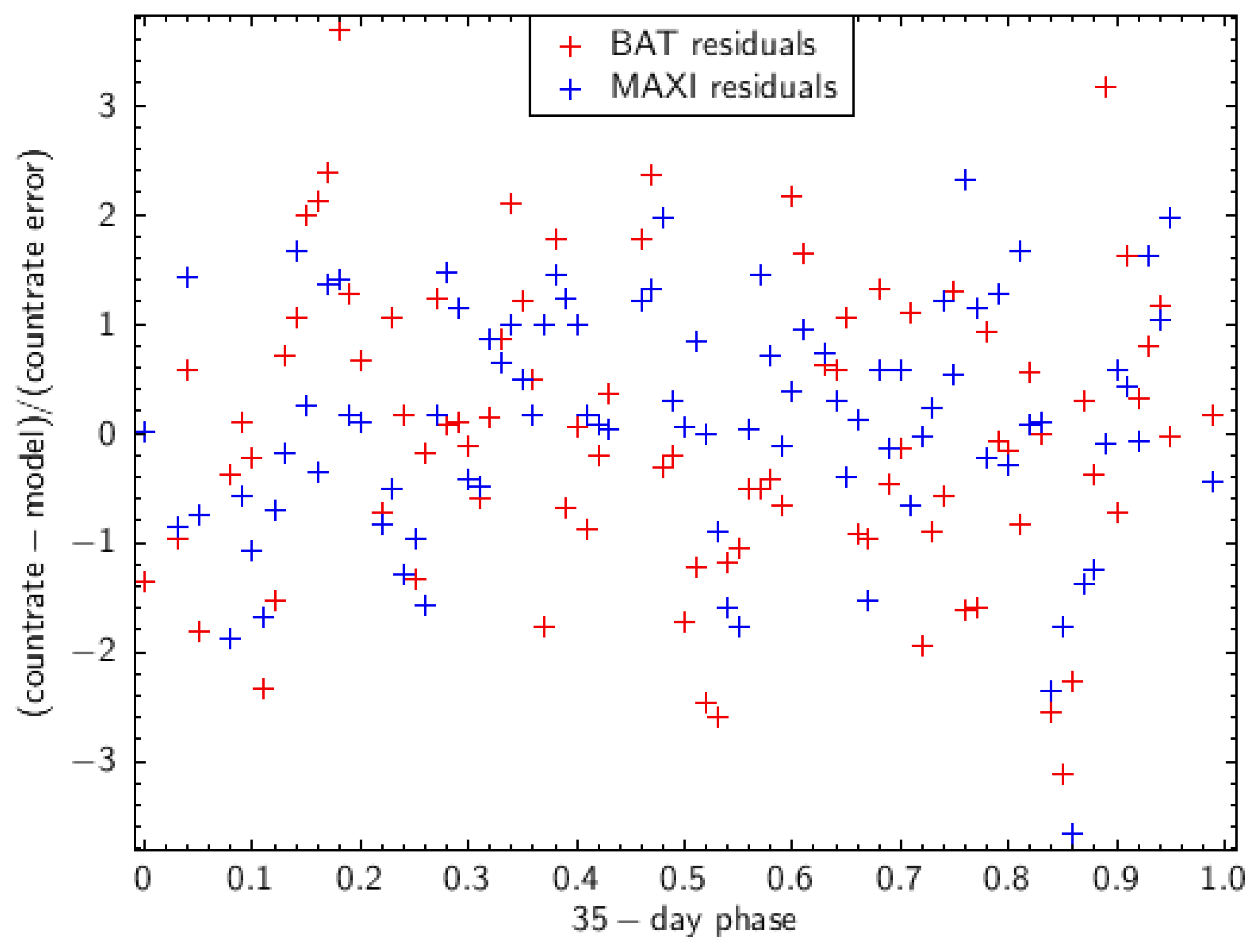 The fit residuals for both BAT and MAXI best fit models are shown in Figure 6. There are some 35-day phases of higher residuals: Turn-on to Main High (phase ≃ 0.87) and Decline (≃0.18)4. This indicates some systematic errors in the data or the model at these 35-day phases. A likely explanation is that the effects of dips has not fully removed in our choice of omitted 35-day phases (see Section 2). Dips occur over a wide range of 35-day phase [22] and neither BAT nor MAXI are sensitive to detect most dips: only the strongest dips affect the MAXI to BAT softness ratio. Thus we cannot fully remove dips, which limits the accuracy of the modelling. The effect of systematic effects in the data is partially mitigated by modelling data sets from 2 different instruments (BAT and MAXI).