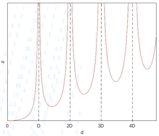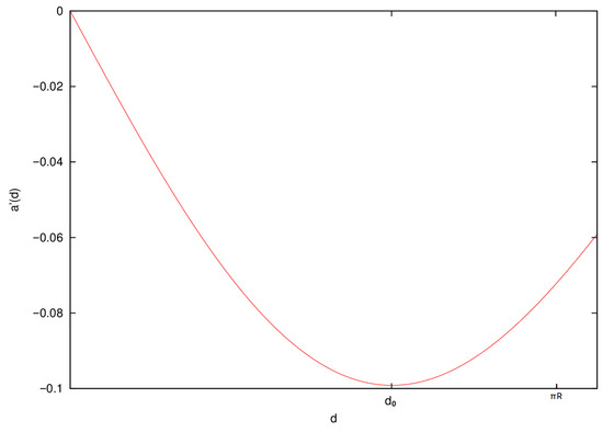 As seen in Figure 2a, the scaling factor decreases with the distance d until degeneration when the antipode A is reached, which corresponds to the distance . From the observer’s perspective, space seems to vanish at this point. An infinitesimally small source located at A appears stretched over the whole celestial vault, and the wavelengths of its photons are affected by this dilation. We get the following distance/redshift relation:
