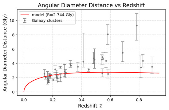 In Figure 5, the theoretical curve of the angular diameter distance relation, derived from Equations (8) and (13) with Gly, is shown together with observational estimates obtained from hydrostatic equilibrium analyses in [25]. Due to the large uncertainties and model dependencies affecting these measurements, no formal fit was performed, but the general behavior remains consistent within the data.
