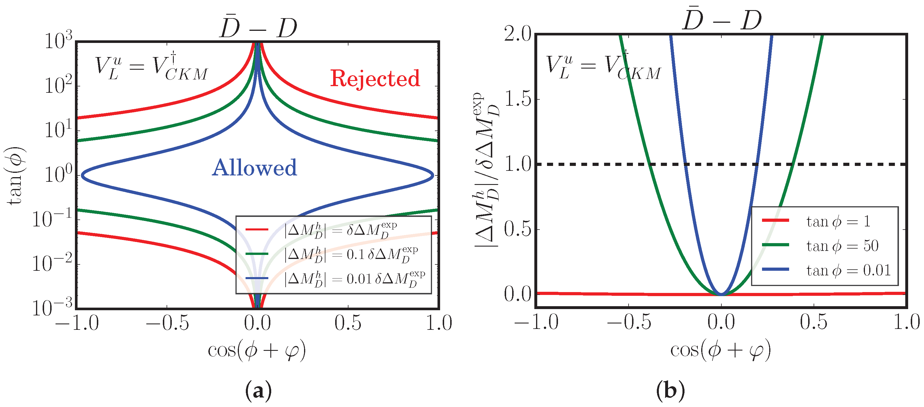 Scenario (i): Consider the scenario in which . For this choice of quark mixing, the contribution of h to the mass differences of K, , and mesons is exactly zero, so the mass difference becomes the only relevant quantity. On the other hand, the relative uncertainty of the measurement of the D- transition is the largest among mesons. This configuration consequently produces the weakest possible constraints over the scalar mixing parameters and , establishing it as the most phenomenologically flexible scenario for 3-3-1 model building.