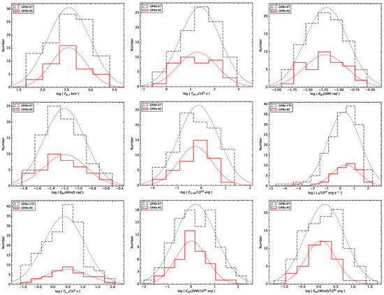 Distributions of , and . The red solid lines represent 40 GRBs in our sample, and the dashed lines represent 97 GRBs in Zhao et al. [56] and 170 GRBs in Deng et al. [37]. The dotted lines represent the best fitting.