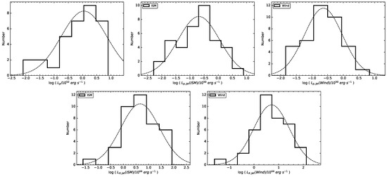In addition, we also analyze the distributions of , , and , and present the results in Figure 3. Similarly, we fit the distributions using the logarithmic Gaussian function. The results show that the median values and the dispersions of , , , , and , are erg s−1, erg s−1, erg s−1, erg s−1, and erg s−1, respectively. The detailed results of all parameters are also listed in Table 3. We find that the jet-corrected emission energy and luminosity are more concentrated.