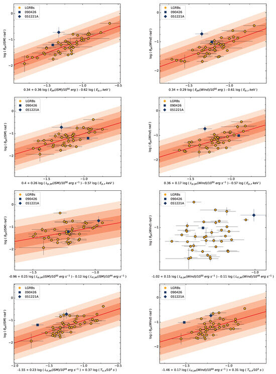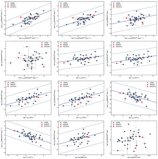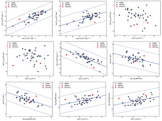 Relationships between , , , , , , , , , and . The blue dots represent LGRBs, the blue solid lines represent the best-fit lines, and the blue dashed lines indicate confidence intervals. The red squares and diamonds indicate the positions of two SGRBs (GRB 090426 and GRB 051221A).