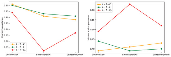 Changes in the Pearson correlation coefficients and intrinsic scatters of the L-T-E, L-T-L, and L-T-Ep correlations with and without jet correction.