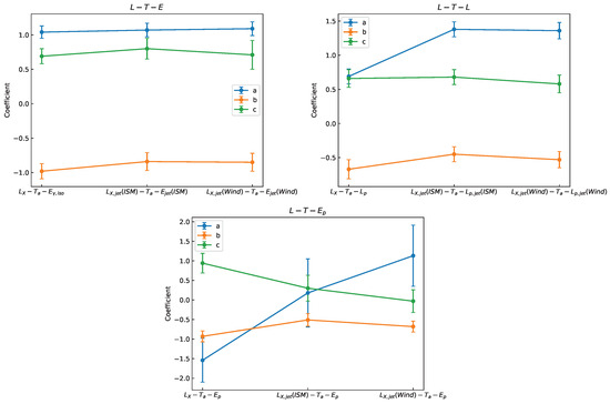 Changes in the coefficients a, b, and c in the L-T-E, L-T-L, and L-T-Ep correlations with and without jet correction.